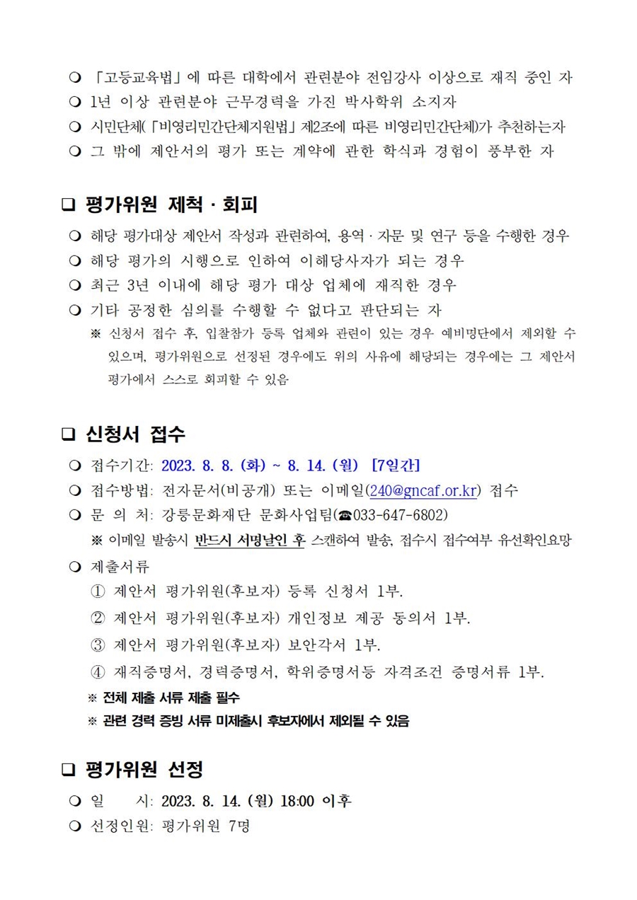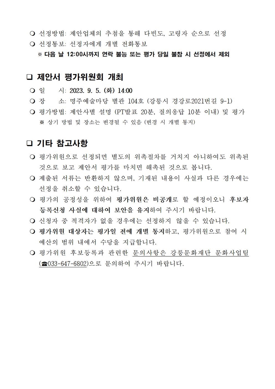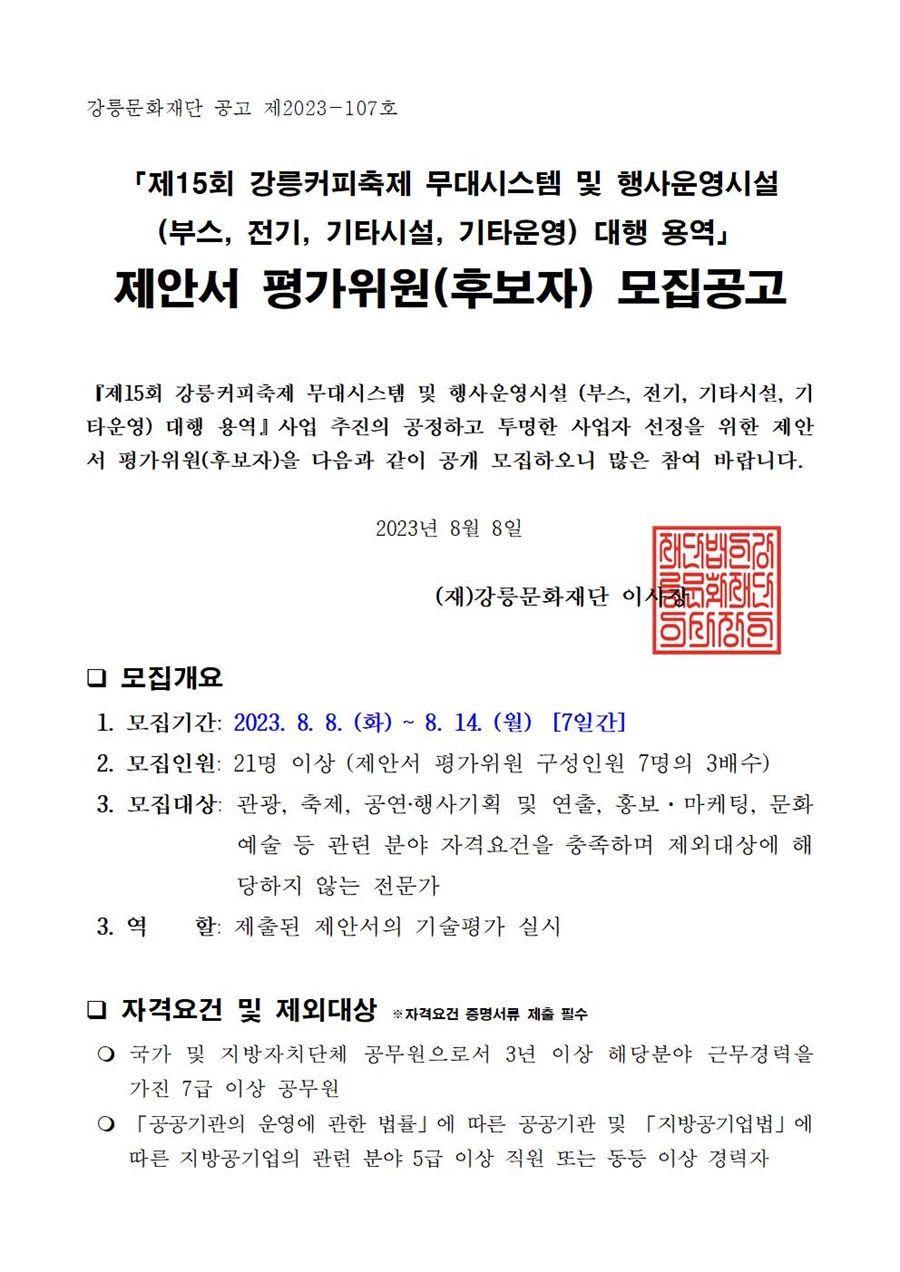 「제15회 강릉커피축제 무대시스템 및 행사운영시설 (부스, 전기, 기타시설, 기타운영) 대행 용역」 제안서 평가위원(후보자) 모집공고
