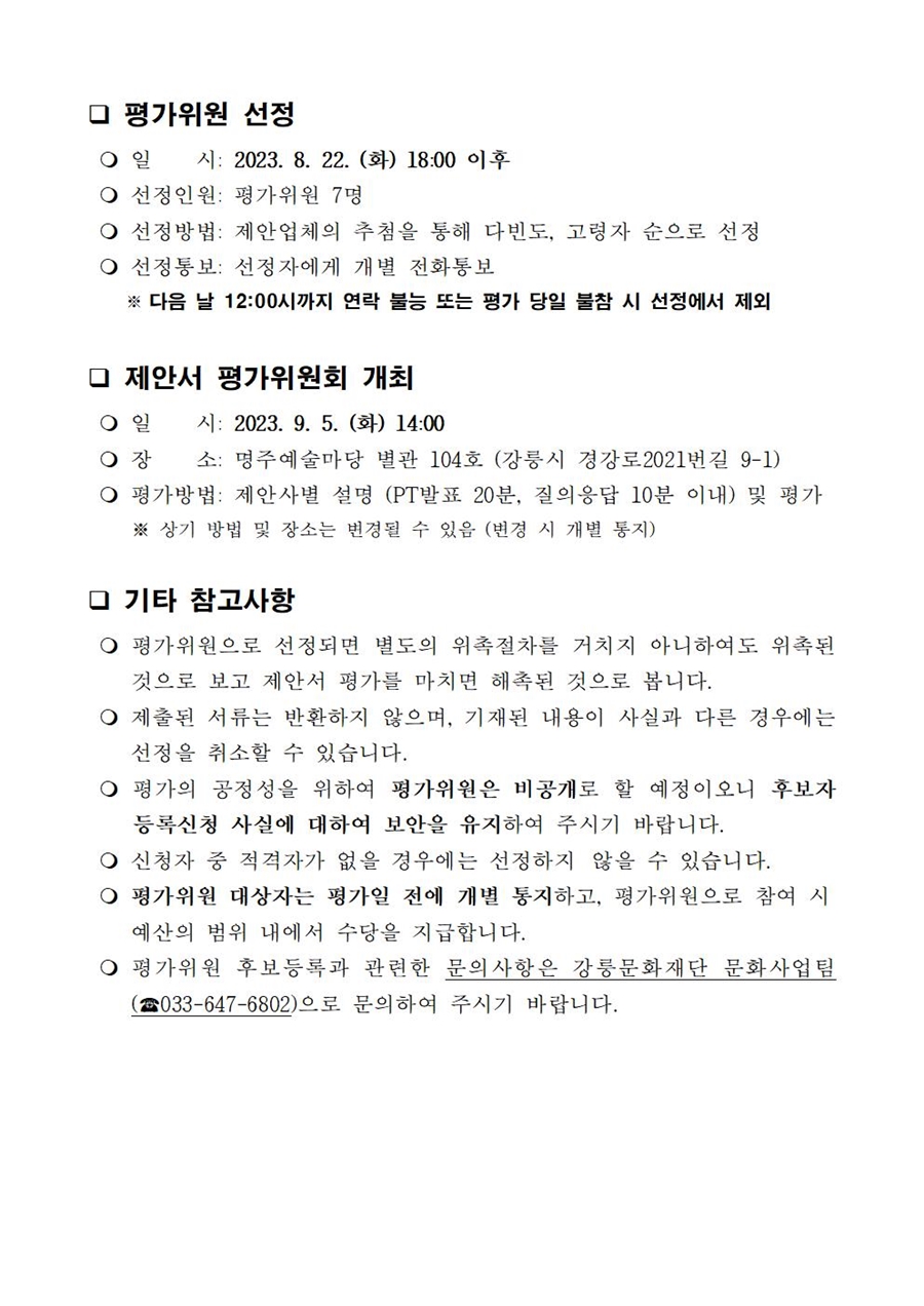 「제15회 강릉커피축제 무대시스템 및 행사운영시설 (부스, 전기, 기타시설, 기타운영) 대행 용역」 제안서 평가위원(후보자) 추가 모집 공고