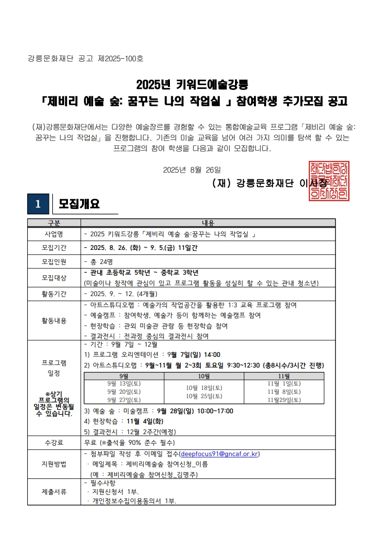 2025 키워드예술강릉 「제비리 예술 숲:꿈꾸는 나의 작업실」참여학생 추가 모집 공고 (~9.5.)