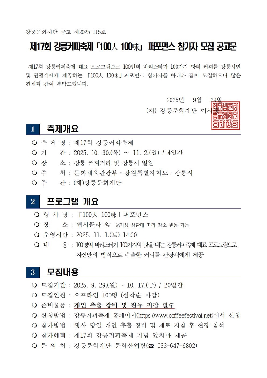 [공고] 제17회 강릉커피축제 「100人 100味」 퍼포먼스 참가자 모집 (~10.17.)