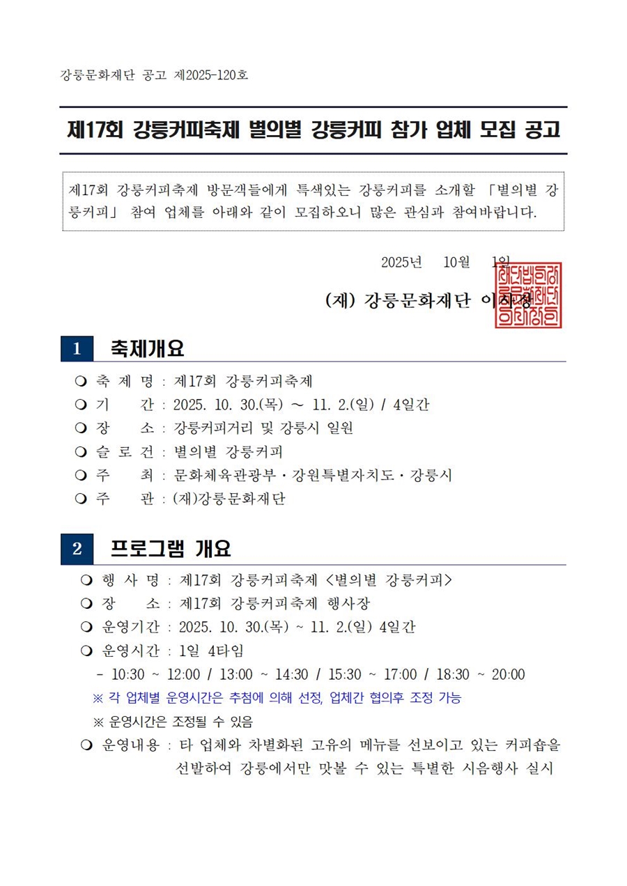 [모집] 제17회 강릉커피축제 별의별 강릉커피 참여업체 모집 (~10.10.)