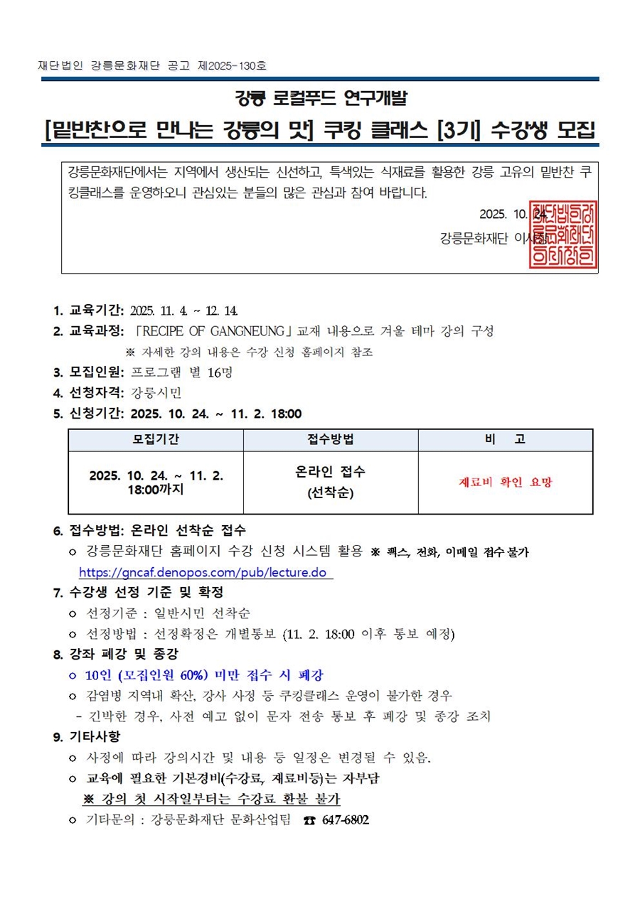 [모집] 「밑반찬으로 만나는 강릉의 맛」쿠킹 클래스 3기 수강생 모집 (~11. 2.)