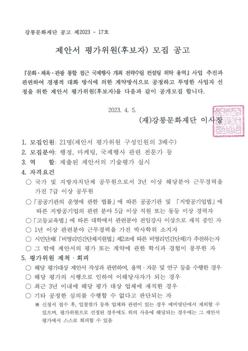문화·체육·관광 통합 접근 국제행사 개최 전략 수립 컨설팅 위탁 용역 제안서 평가위원(후보자) 모집 공고