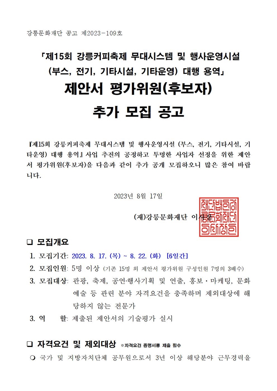 「제15회 강릉커피축제 무대시스템 및 행사운영시설 (부스, 전기, 기타시설, 기타운영) 대행 용역」 제안서 평가위원(후보자) 추가 모집 공고