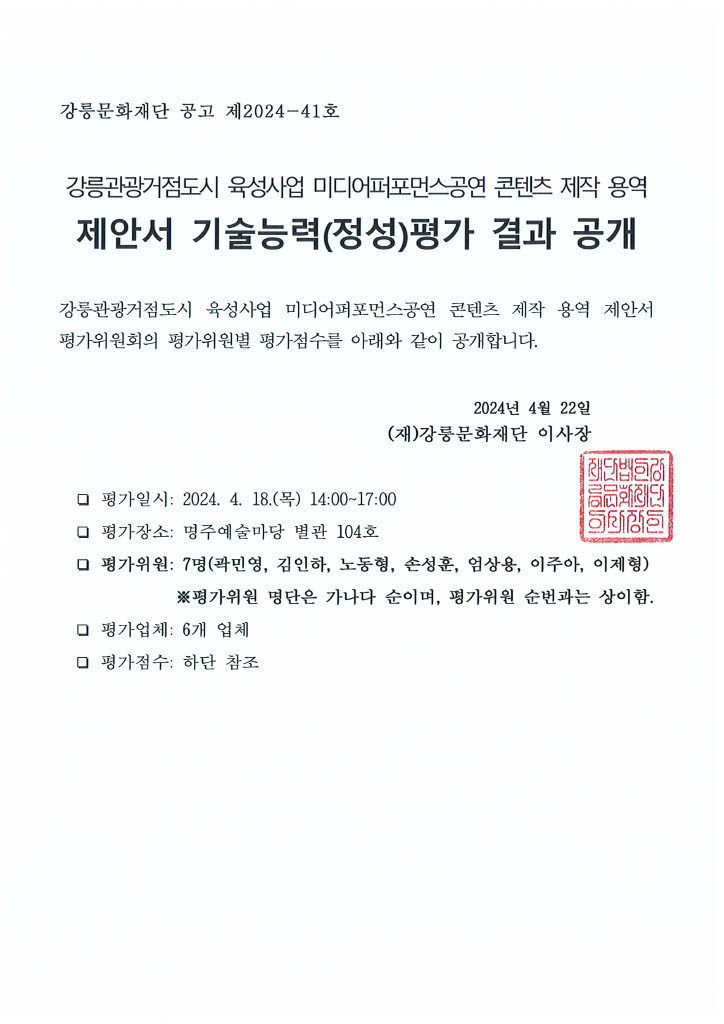 강릉관광거점도시 육성사업 미디어퍼포먼스공연 콘텐츠 제작 용역 제안서 기술능력(정성)평가 결과 공개