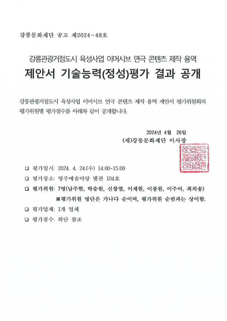 강릉관광거점도시 육성사업 이머시브 연극 콘텐츠 제작 용역 제안서 기술능력(정성)평가 결과 공개