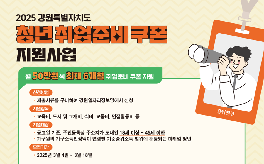 3. 지원대상 : 공고일 기준 주민등록상 주소지가 강원특별자치도내인 만 18세 이상~만45세 이하