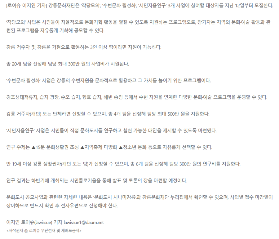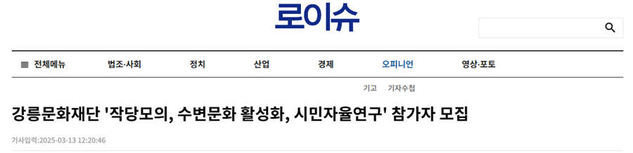 [로이슈] 강릉문화재단 '작당모의, 수변문화 활성화, 시민자율연구' 참가자 모집
