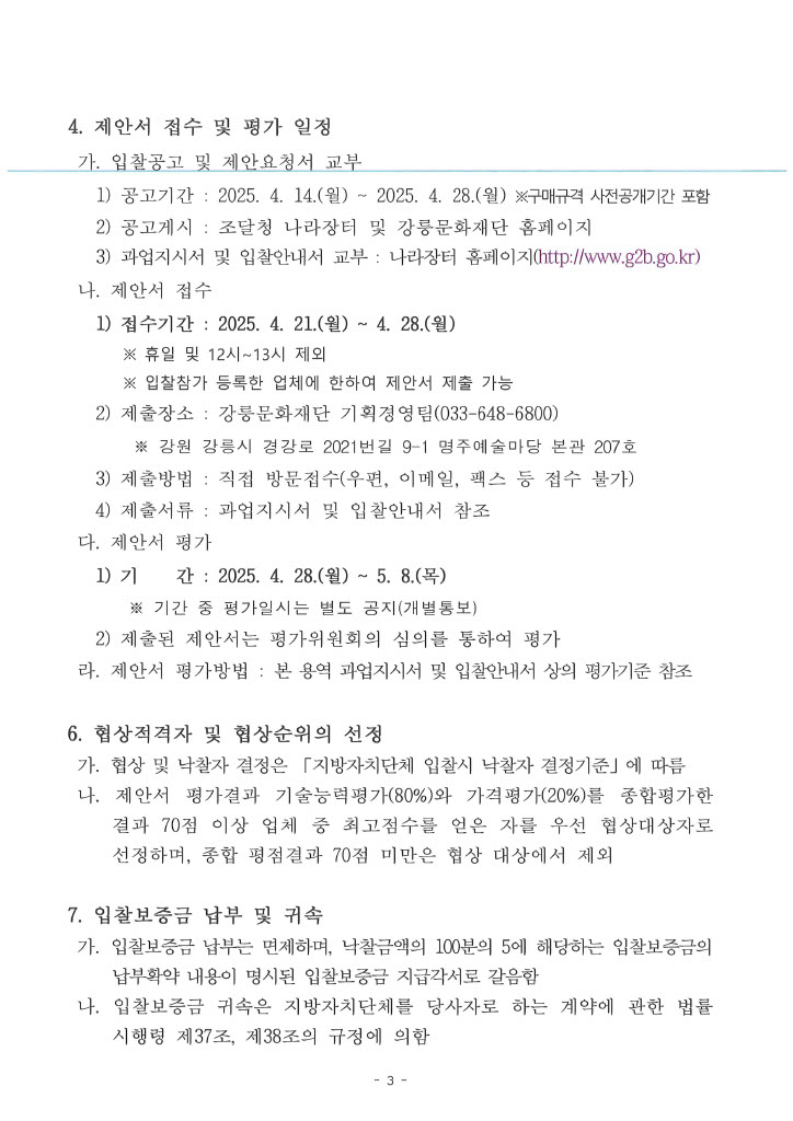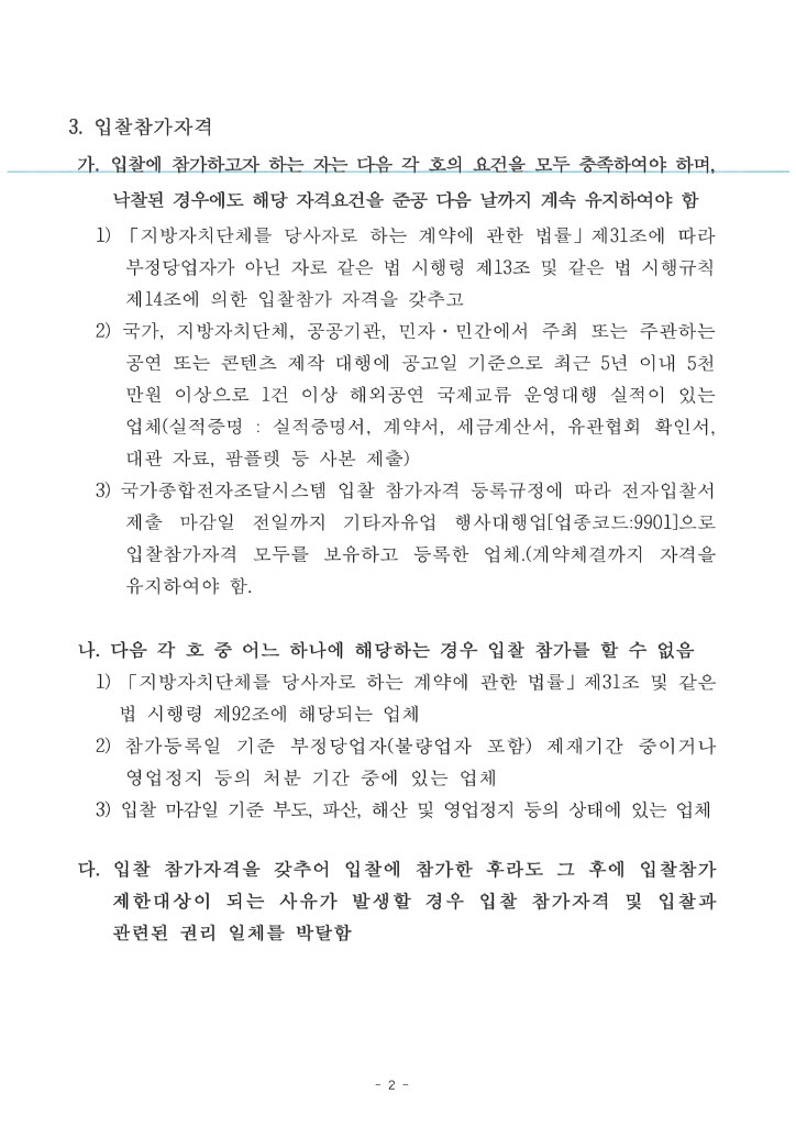 2. 과업지시서 및 입찰안내서(관광거점도시 육성사업 강릉관광브랜드공연 2025 강릉국제공연예술페스티벌 해외공연 섭외 및 운영 용역) (2).hwp (269 KB)