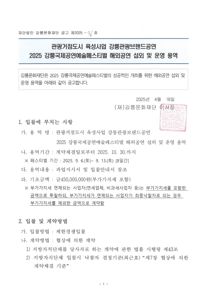 1. 입찰 공고 (관광거점도시 육성사업 강릉관광브랜드공연 2025 강릉국제공연예술페스티벌 해외공연 초청 및 운영 용역)_수정.pdf (2 MB)