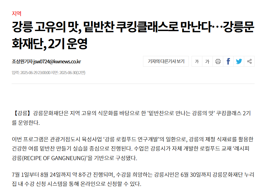 [강원일보] 강릉 고유의 맛, 밑반찬 쿠킹클래스로 만난다... 강릉문화재단, 2기 운영