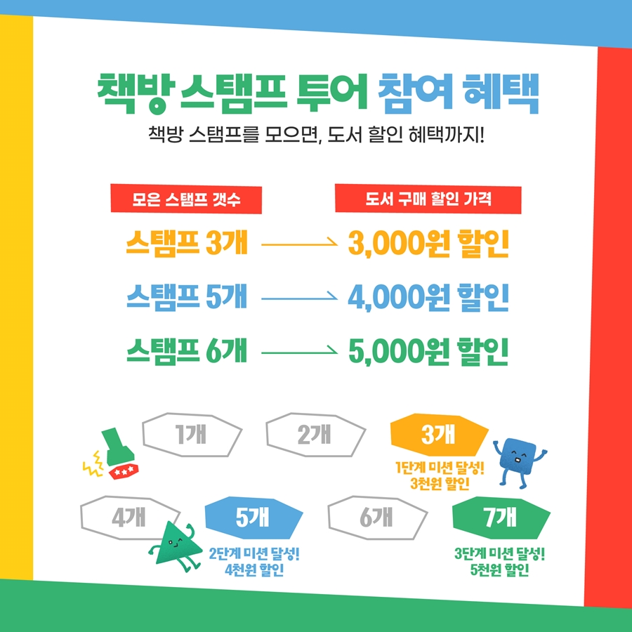 3. 스탬프 3, 5, 7개마다 도서구입시 3천원, 4천원, 5천원 할인받기!
