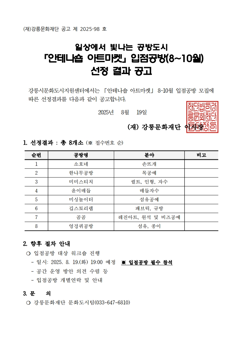 [공고] 일상에서 빛나는 공방도시「안테나숍 아트마켓」입점공방(8~10월) 선정 결과 공고