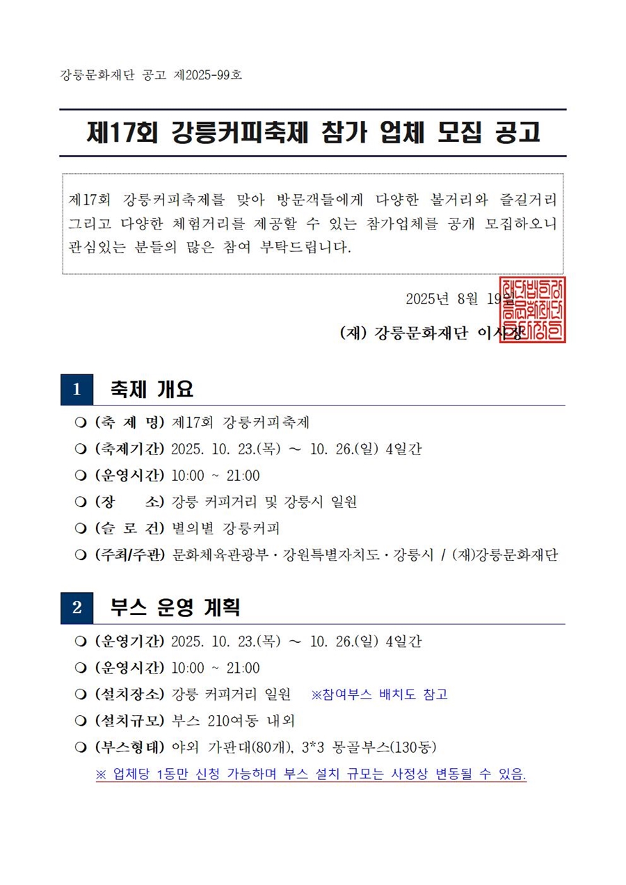 [공고] 제17회 강릉커피축제 참가 업체 모집 공고 (~9.5.)