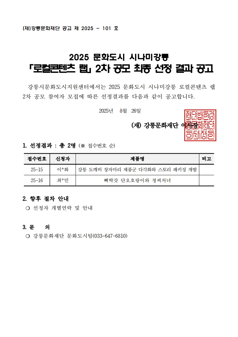 [공고] 2025 문화도시 시나미강릉 「로컬콘텐츠 랩」 2차 공모 최종 선정 결과 공고