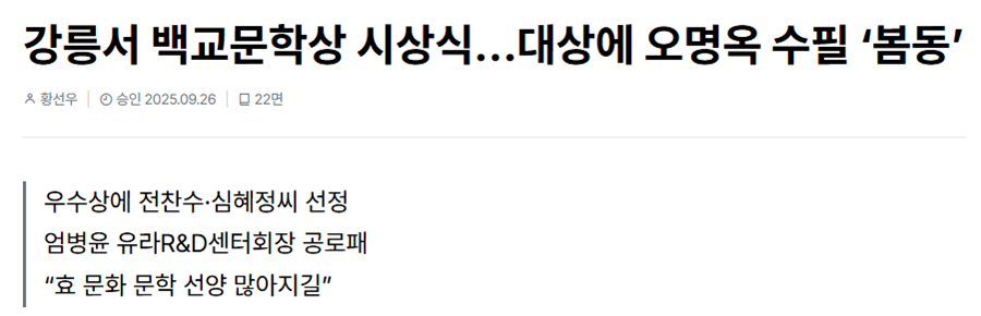 [강원도민일보] 강릉서 백교문학상 시상식... 대상에 오명옥 수필 '봄동'