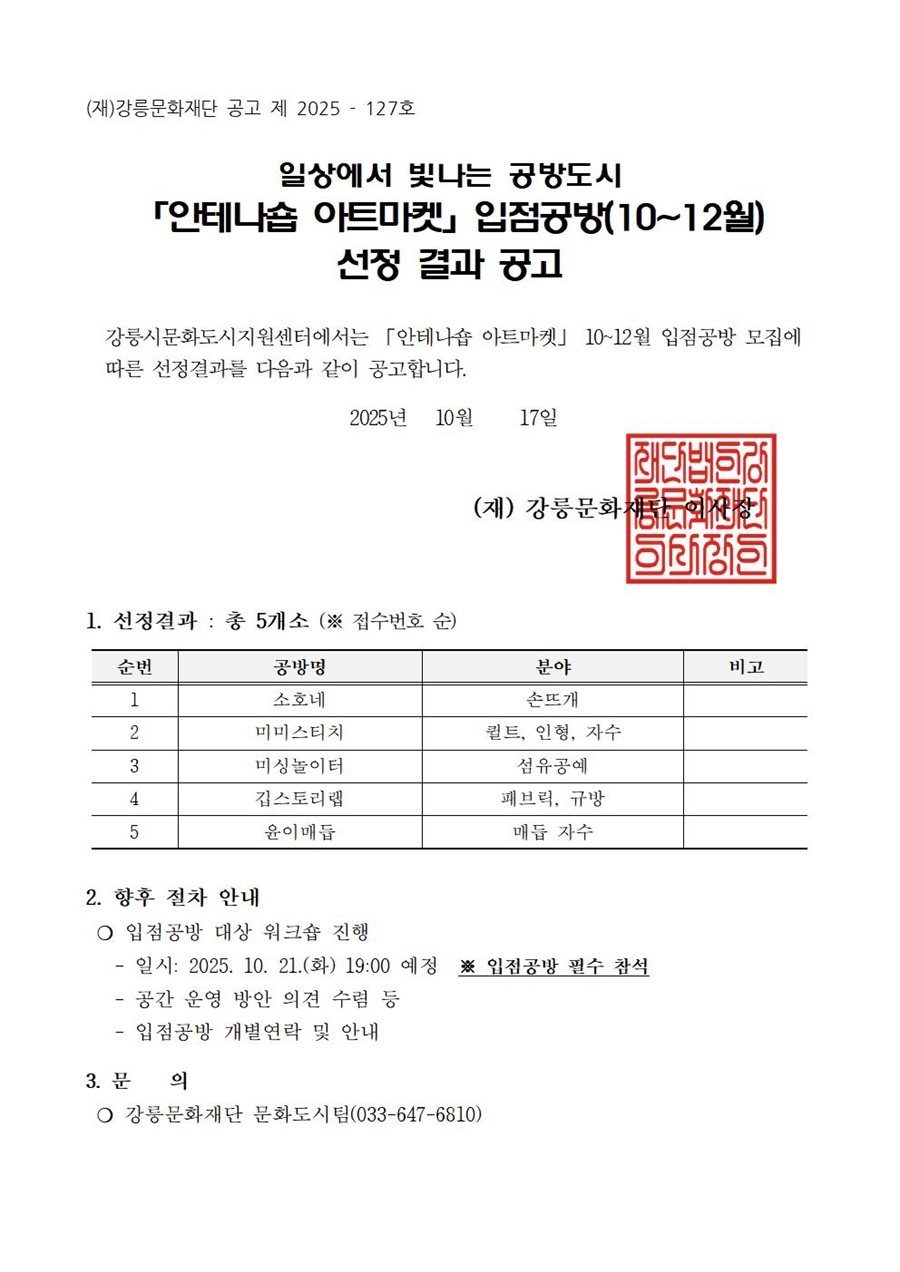 [공고] 일상에서 빛나는 공방도시「안테나숍 아트마켓」입점공방(10~12월) 선정 결과 공고