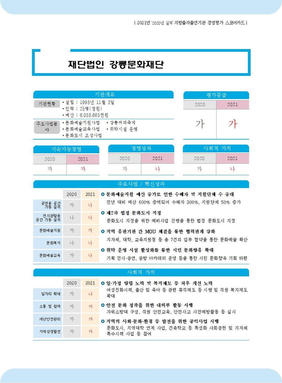 2021년도 (2020년 실적) (재) 강릉문화재단 경영실적평가 결과 및 스코어카드