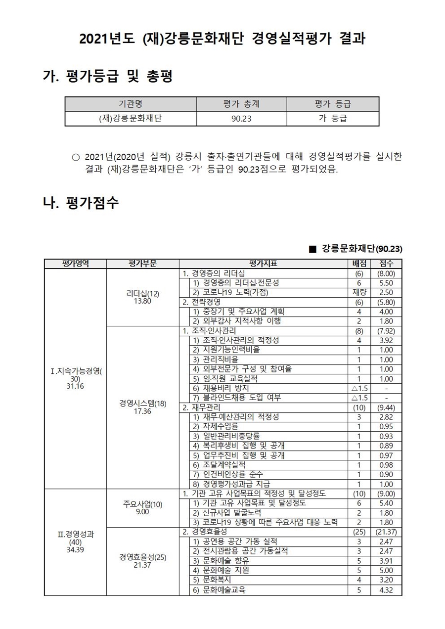2022년도(2021년 실적) 재단법인 강릉문화재단 경영평가실적 결과